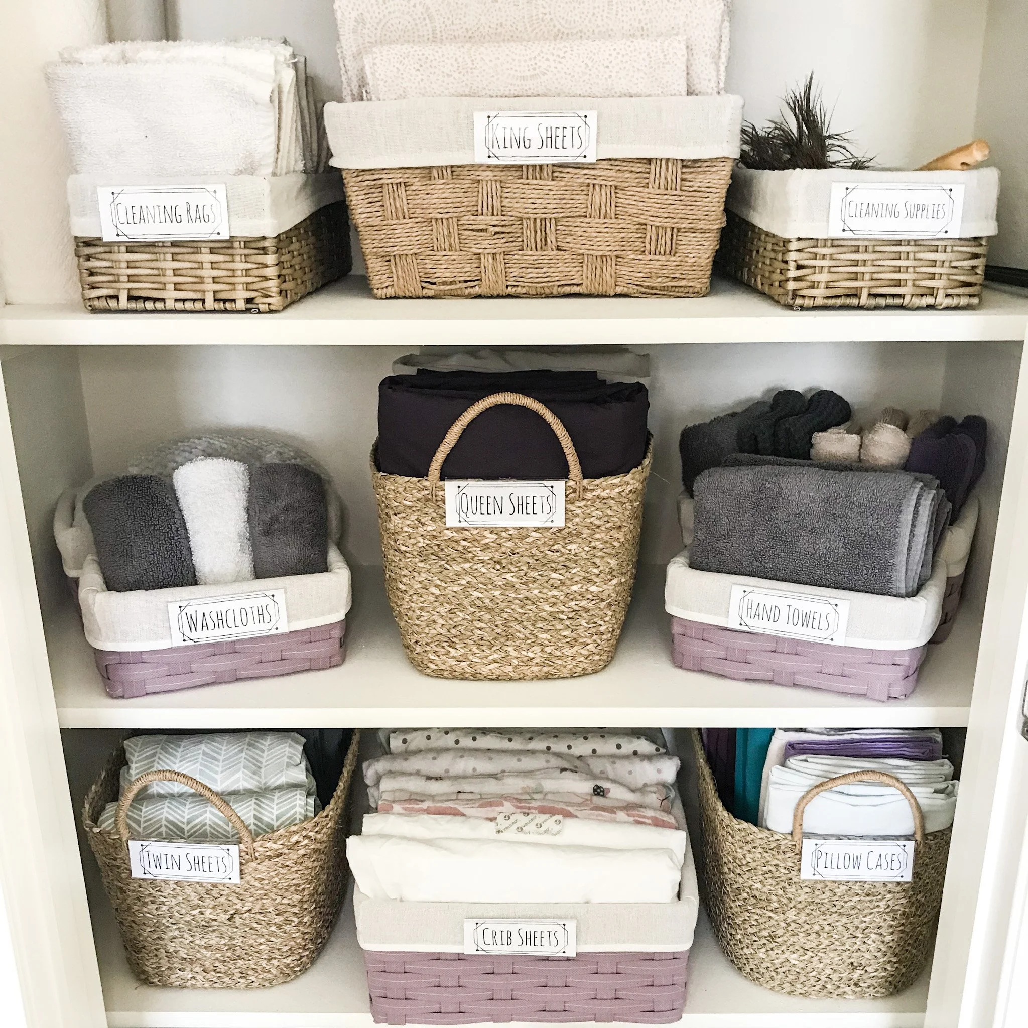This closet is home to a mix of towels and bedding storage. After sorting, folding, measuring, then shopping for the perfect containers, these lovely labeled baskets were added to create the chic and cozy system you see before you.